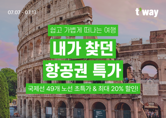 티웨이항공이 유럽·호주·일본 등 49개 해외노선을 대상으로 일주일간 탑승권을 할인하는 '내가 찾던 항공권 특가' 프로모션을 진행한다고 7일 밝혔다.