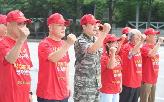 김계환 전 해병대 사령관이 순직해병 특검에 출석한 7일 서울 서초구 특검 사무실 앞에서 해병대예비역연대 회원들이 사건 진상 규명 촉구 기자회견을 하고 있다.