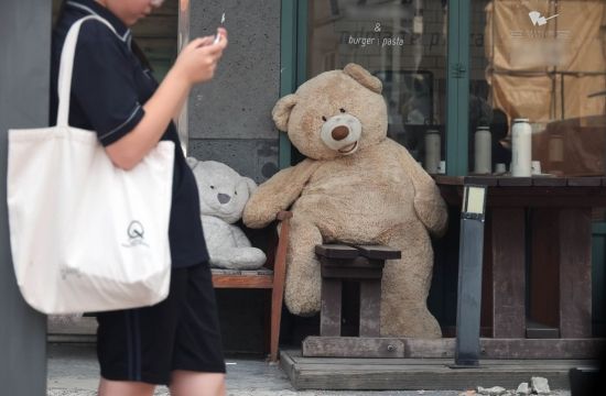 연일 35도를 웃도는 폭염의 기세에 도심이 이글거리고 있다. 서울 성북구의 한 가게 앞에 진열된 대형 곰인형도 더위에 지친 듯 축 늘어져 있다.
