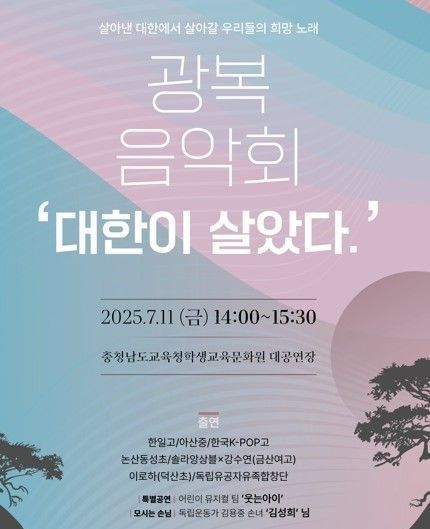 교육청 관계자는 "'대한이 살았다' 광복음악회는 충남의 교육공동체가 희망을 노래하고 대화합하는 역사의 장이 될 수 있도록 알차고 의미 있게 준비할 것"이라고 말했다.