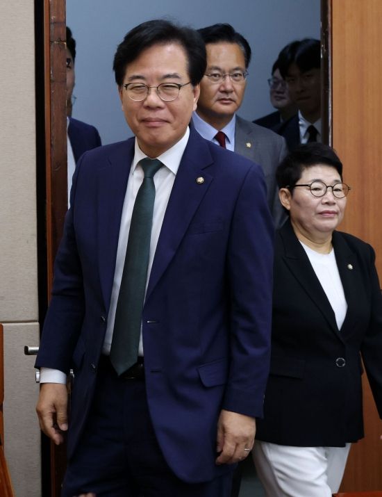 9일 국회에서 열린 기획재정위원회 전체회의에 국민의힘 소속 송언석 위원장과 차기 기획재정위원장에 내정된 임이자 의원(오른쪽)이 입장하고 있다.