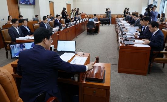 국회 기획재정위원회 국민의힘 소속 송언석 위원장이 9일 국회에서 열린 구윤철 기획재정부 장관, 임광현 국세청장 후보자 인사청문요청안 등을 심의하는 전체회의에서 의사봉을 두드리고 있다.