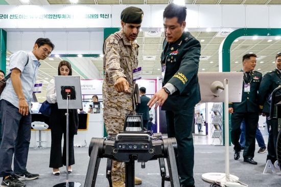9일 서울 강남구 코엑스에서 열린 '2025 무인이동체산업엑스포'에 참가한 외국 군인이 대태러작전용 다족보행로봇을 보고 있다.