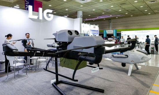 9일 서울 강남구 코엑스에서 열린 '2025 무인이동체산업엑스포'에서 LIG 부스에 하이브리드 수송드론이 전시돼 있다.