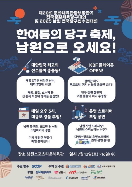 전북 남원시가 오는 12일부터 16일까지 남원종합스포츠타운 실내체육관에서 '제20회 문화체육관광부장관기 전국생활체육당구대회 및 2025 남원 전국당구선수권대회'가 열린다.