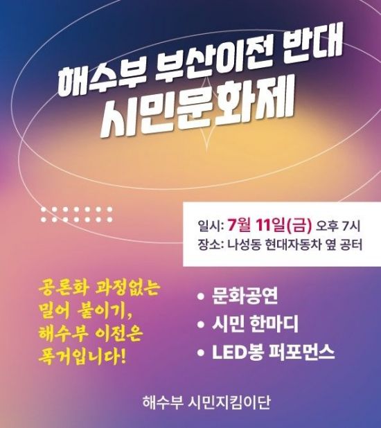 해양수산부(이하 해수부) 부산 이전을 둘러싸고 논란이 확산되고 있는 가운데, 해수부 노동조합 집행부가 서울 국회에서 단식투쟁을 진행 중이다. 이에 따라 오는 11일 해양수산부 시민지킴이단 주최로 세종시에서 열릴 시민문화제에 해수부 노동조합 관계자들이 불참하는 것으로 확인됐다.
