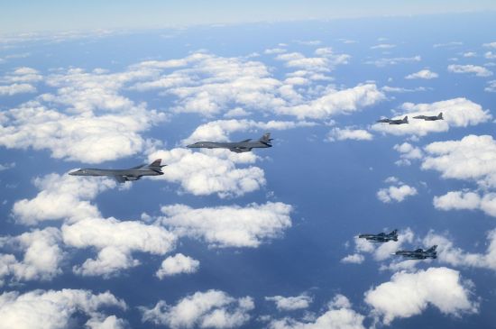 한미일은 지난달 18일에도 한국 공군 F-15K 전투기, 미국 공군 F-16 전투기, 일본 항공자위대 F-2 전투기가 참가한 가운데 공중훈련을 실시했다. 당시에는 전략폭격기가 훈련에 참여하진 않았다.