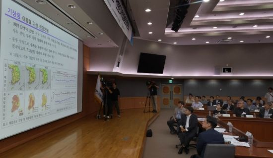 연일 폭염이 기승을 부리고 있는 가운데 11일 서울 종로구 정부서울청사에서 열린 폭염대책 관계기관 전문가 합동토론회에서 기상청 관계자가 여름철 기상전망을 하고 있다.