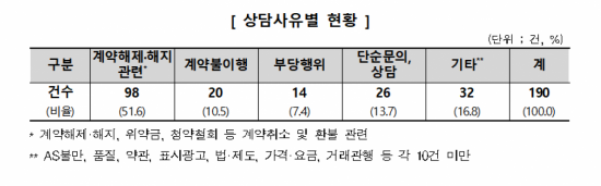 상담 사유를 살펴보면 '계약해제·해지 관련'이 98건(51.6%)으로 가장 많았고, '계약불이행' 20건(10.5%), '부당행위' 14건(7.4%) 순이었다.