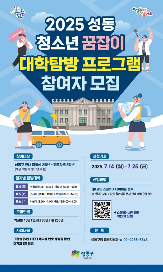 서울 성동구가 대학 생활을 미리 체험할 수 있는 ‘청소년 꿈잡이 대학탐방 프로그램’을 여름방학 기간 운영한다.