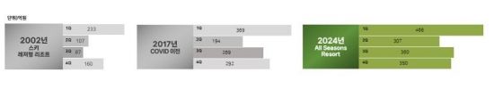 모나용평은 과거 겨울 스키 중심 매출에 크게 의존했던 구조에서 벗어나 봄·여름·가을 시즌의 실적을 비약적으로 성장시키며 '사계절 리조트(All Seasons Resort)'로 자리매김하고 있다. 실제 지난해 3분기(여름) 운영 매출은 360억원으로, 2002년(87억원) 대비 약 4배 이상, 2017년(269억원)과 비교해도 약 34% 성장하며 계절별 매출 편차를 크게 줄였다. 사계절을 아우르는 레저·휴양 복합 플랫폼 전략은 단순한 계절형 리조트에서 벗어나 지속 가능한 성장을 이끄는 핵심 동력으로 작용하고 있다.