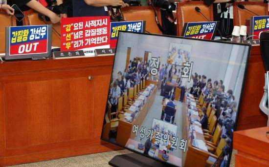 14일 국회 여성가족위원회에서 열린 강선우 여성가족부 장관 후보자 인사청문회에서 여야 의원들간의 마찰로 청문회가 정회되고 있다.