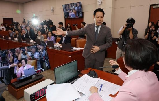 14일 국회 여성가족위원회에서 열린 강선우 여성가족부 장관 후보자 인사청문회에서 김한규 여당 간사가 이인선 위원장에게 항의하고 있다.