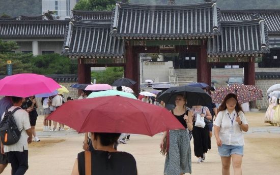 비가 내리며 찜통더위가 한풀 꺽인 14일 서울 종로 경복궁을 찾은 관광객들이 우산을 쓰고 여행을 즐기고 있다. 기상청은 일부 지역에서는 돌풍과 천둥·번개를 동반한 시간당 10~20mm의 강한 비가 쏟아질 수 있다고 예보했다.