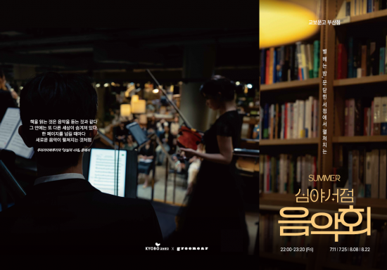 교보문고 부산점에서는 늦은 밤 10시, 서점이 프라이빗한 공연장으로 변신하는 색다른 콘셉트의 '심야서점음악회'가 오는 11일·25일과 8월 8일·22일 총 4회에 걸쳐 개최한다. '여름 밤의 페이지와 선율'을 테마로, '스토너', '위대한 개츠비' 등 책과 클래식 음악을 스토리텔링 형식으로 엮은 콘서트를 진행한다. 다과와 굿즈 등을 제공하며, 유료 사전 예매를 통해 참여 가능하다.