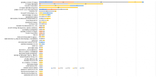 특허 피인용 횟수와 특허 패밀리 수(같은 발명에 기반한 특허의 모임)를 기준으로 한 핵심 특허 수는 LG화학, LG에너지솔루션, 삼성SDI, 대주전자재료 등 한국 기업들이 선두에 있는 것으로 나타났다. 미국의 에너베이트(Enevate), 일본의 신에쓰(Shin-Etsu) 등도 다수의 핵심 특허를 보유하고 있다.