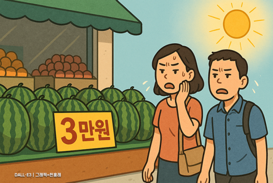 한국농수산식품유통공사에 따르면 전일 기준 수박(상품) 1개 가격은 2만9816원으로 평년 대비 41.8% 비싼 상황이다. 농식품부 관계자는 "폭염에 따른 수요 증가와 올해 5~6월 일조시간 감소에 따른 출하 지연으로 전년 대비 높은 가격을 보인다"며 "그러나 7월 하순부터는 작황이 양호한 강원 양구·경북 봉화·전북 고창 등에서 출하 물량이 확대되고, 충북 음성 2기작 수박도 출하가 시작되며 공급이 원활해질 것으로 전망된다"고 말했다.