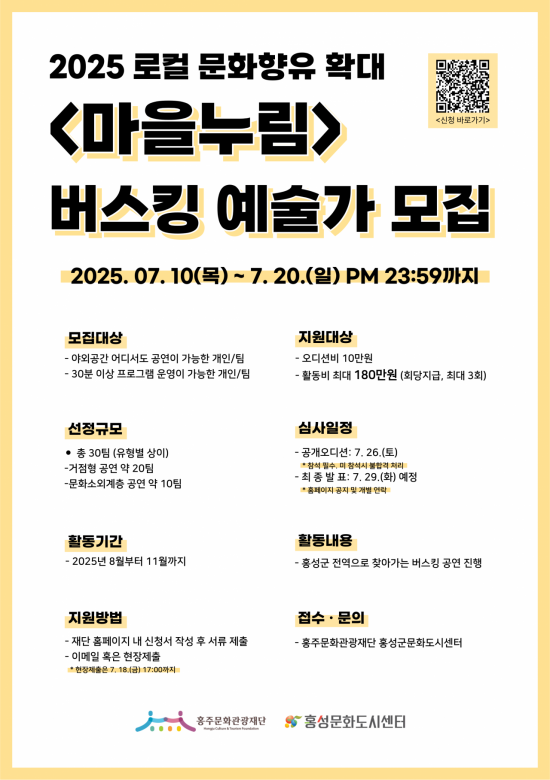충남 홍성군 홍주 문화관광재단은 오는 20일까지 '2025 로컬 문화 향유 확대 <마을 누림> 버스킹 예술가'를 공개 모집한다고 15일 밝혔다.