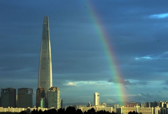 15일 오후 서울 지역에 세찬 소나기가 지나고 난 후 잠실 서울스카이 옆으로 이쁜 무지개가 걸렸다.