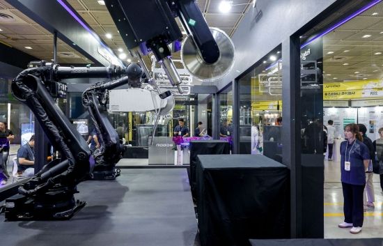 16일 서울 강남구 코엑스에서 열린 '제3회 농식품테크 스타트업 창업박람회'에 참가한 관람객이 축산 가공에 사용 가능한 로봇을 보고 있다.