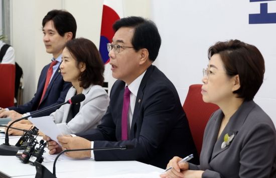 송언석 국민의힘 비대위원장 겸 원내대표가 16일 국회에서 기자간담회를 열어 강선우 여성가족부 장관 후보자의 사퇴를 요구하는 등 인사청문회 관련 입장을 밝히고 있다.