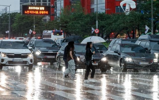 서울 전역에 호우주의보가 발령된 17일 서울 여의도 버스환승센터에서 직장인들이 우산을 꼭 붙잡고 출근길에 오르고 있다.