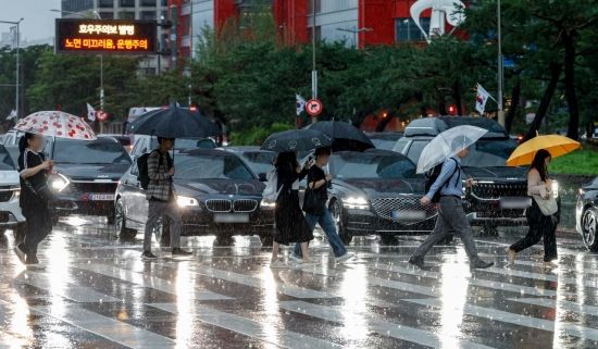 서울 전역에 호우주의보가 발령된 17일 서울 여의도 버스환승센터에서 직장인들이 우산을 꼭 붙잡고 출근길에 오르고 있다.