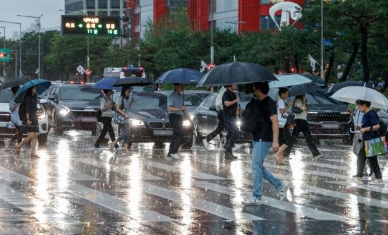 서울 전역에 호우주의보가 발령된 17일 서울 여의도 버스환승센터에서 직장인들이 우산을 꼭 붙잡고 출근길에 오르고 있다.