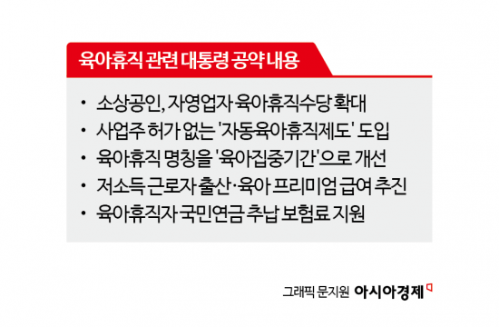 앞서 이 대통령은 ▲소상공인, 자영업자 육아휴직수당 확대 ▲사업주 명시적 허가 없이 시작하는 '자동육아휴직제도' 도입 ▲저소득 근로자 '출산·육아 워라밸 프리미엄' 급여 추진 ▲육아휴직자 국민연금 추납 보험료 지원 추진 ▲연구자 육아휴직 활성화를 위한 대체 인력 채용 추진 등의 공약을 내놓은 바 있다. 저출생 극복이 시급한 과제이고 여야 이견이 적은 분야이기에 정부가 의지를 보인다면 속속 추진이 가능할 것이라는 게 정부 안팎의 시각이다.