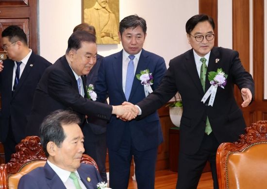 우원식 국회의장이 17일 국회에서 열린 제77주년 제헌절 경축식에 앞서 전직 국회의장 등 원로들과 인사하고 있다.