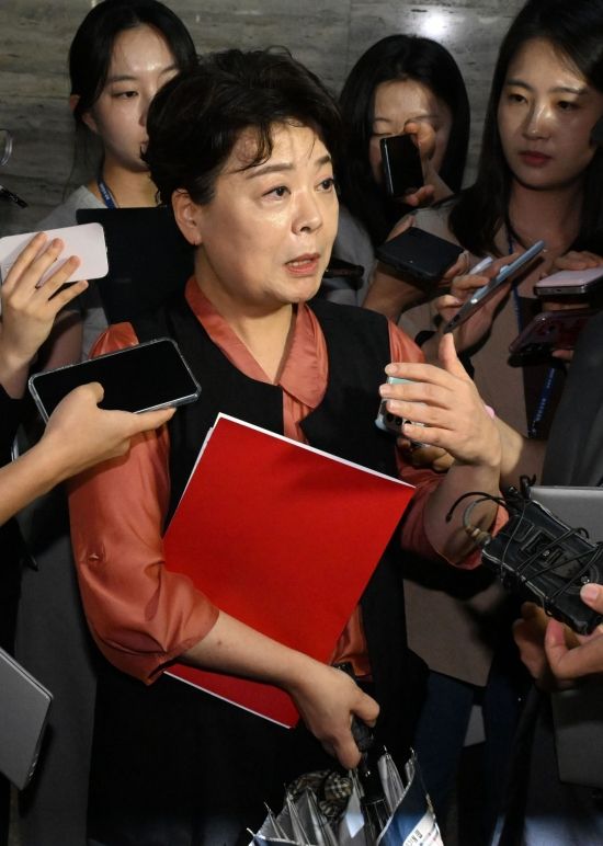 윤희숙 국민의힘 혁신위원장이 17일 국회에서 열린 비상대책위원회의에 참석한 뒤 나와 취재진의 질문을 받고 있다. 윤 위원장은 전날 나경원·윤상현·장동혁 의원과 송언석 비대위원장에게 거취 결정을 요구하는 인적쇄신안을 발표했다. 2025.7.17 김현민 기자