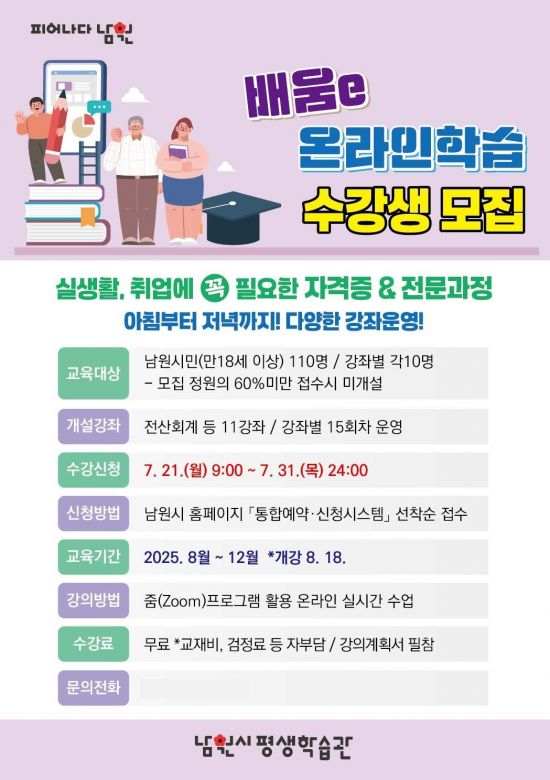 전북 남원시가 오는 21~31일 남원시평생학습관에서 '배움e 온라인 학습' 수강생을 선착순 모집한다.