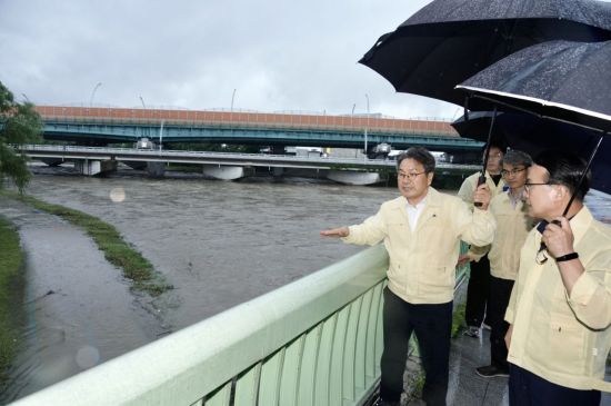 강기정 광주시장이 17일 홍수주의보가 발령된 서구 유촌교를 찾아 현장 상황을 긴급 점검하고, 철저한 호우 대비를 지시하고 있다. 광주시 제공