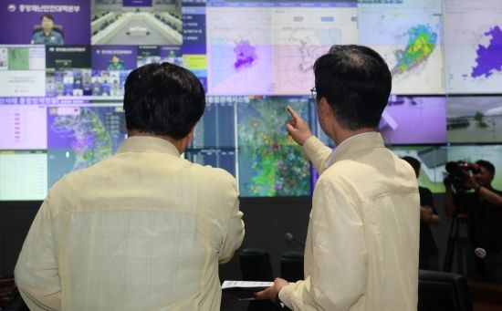 김민재 행정안전부장관 직무대행인 중앙재난안전대책본부장(오른쪽)이 17일 서울 종로구 정부서울청사에서 열린 중앙재난안전대책본부 회의에 앞서 호우피해 및 대처 상황을 점검하고 있다.