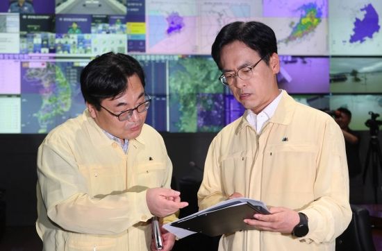 김민재 행정안전부장관 직무대행인 중앙재난안전대책본부장(오른쪽)이 17일 서울 종로구 정부서울청사에서 열린 중앙재난안전대책본부 회의에 앞서 호우피해 및 대처 상황을 점검하고 있다.