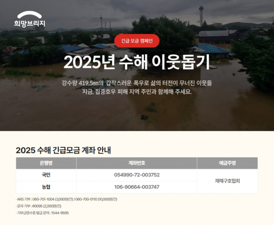 희망브리지는 "국내 자연 재난 피해 구호금을 전달할 수 있는 유일한 법정구호단체"라면서 "이번에 모여진 성금은 지역별·재해별 성금 지원의 중복·누락·편중을 막고 균등하게 지원하는 배분 원칙에 따라 피해 지역의 복구와 이재민들의 일상 회복을 위해 사용할 예정"이라고 말했다.