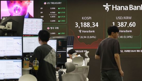 코스피지수가 하루만에 3,200선이 무너진 16일 서울 중구 하나은행 딜링룸 모니터에 코스피를 비롯해 원/환율, 코스닥 지수가 표시돼 있다. 이날 코스피는 전 거래일 대비 0.24% 내린 3207.48에 코스닥지수도 0.34% 내린 810.09로 시작해 하락폭을 키우고 있다. 2025.7.16 조용준 기자
