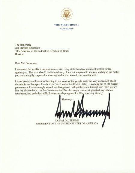 이 서한에서 트럼프 대통령은 보우소나루 전 대통령을 "브라질의 진정한 애국자이자 부당한 체제의 희생자"라고 칭하며, 현 룰라 정부의 정책과 사법 당국의 행보를 강하게 비판했다. 특히 브라질 대법원에 대해선 표현의 자유를 제한한다며 "이는 국제적인 수치"라고 주장했다.