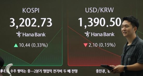 미 나스닥이 사상최고치로 마감한 가운데 코스피지수도 3200선을 회복하며 출발한 18일 서울 중구 하나은행 딜링룸 모니터에 코스피를 비롯해 원/환율 등이 표시돼 있다. 이날 코스피는 전장보다 8.15포인트(0.26%) 오른 3200.44 시작해 강보합을 이어가고 있다.