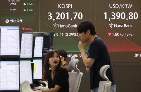 미 나스닥이 사상최고치로 마감한 가운데 코스피지수도 3200선을 회복하며 출발한 18일 서울 중구 하나은행 딜링룸 모니터에 코스피를 비롯해 원/환율 등이 표시돼 있다. 이날 코스피는 전장보다 8.15포인트(0.26%) 오른 3200.44 시작해 강보합을 이어가고 있다.