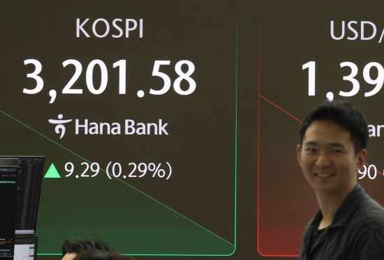 미 나스닥이 사상최고치로 마감한 가운데 코스피지수도 3200선을 회복하며 출발한 18일 서울 중구 하나은행 딜링룸 모니터에 코스피를 비롯해 원/환율 등이 표시돼 있다. 이날 코스피는 전장보다 8.15포인트(0.26%) 오른 3200.44 시작해 강보합을 이어가고 있다.