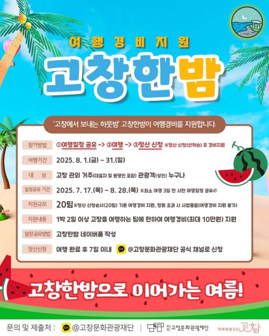 전북 고창문화관광재단은 체류형 관광객 경비지원 프로그램인 '고창한밤'이 8월에도 여행경비를 지원한다고 18일 밝혔다.