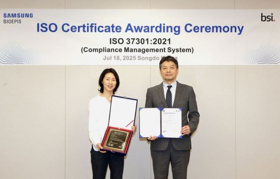 삼성바이오에피스가 국제표준화기구(ISO)에서 제정한 준법경영시스템 국제 인증인 'ISO 37301'을 획득해 18일 수여식을 진행했다.