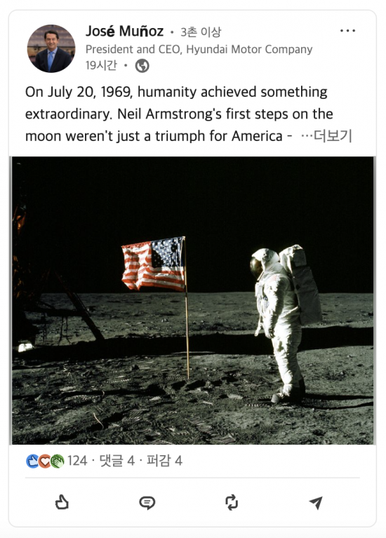 무뇨스 사장은 전날 자신의 사회관계망서비스(SNS) 링크드인에서 "1969년 7월20일 닐 암스트롱이 달에 첫발을 디딘 순간은 미국만의 승리가 아닌 인간의 창의력과 협업, 불가능에 도전하는 집념의 승리였다"며 "인류를 달에 보냈던 그 정신은 지금 현대차의 '인류를 위한 진보'(Progress for Humanity) 비전을 이끄는 원동력이기도 하다"고 했다.