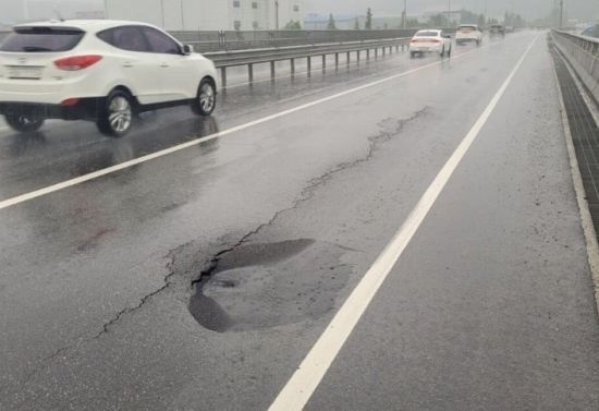 사진은 가장교차로 고가도로 수원 방향 2차 도로에 금이 간 모습이다. 도로 한 가운데에 지름 수십㎝로 추정되는 포트홀(아스팔트 도로 파손으로 인해 움푹 패거나 구멍이 난 상태)이 보이며, 포트홀을 중심으로 상당한 길이 금이 나 있다.