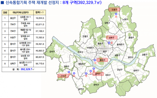 서울시가 신속통합기획 후보지 8곳과 기존 신통기획·공공재개발 선정지를 토지거래허가구역으로 지정했다.