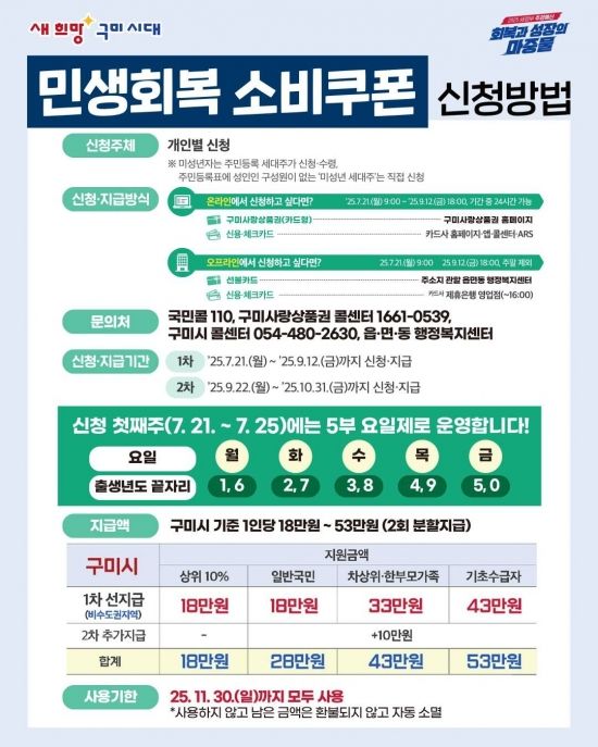 한편, 구미시는 소비쿠폰의 지역 내 소비 효과를 극대화하기 위해 전통시장·골목상권 등 사용 가능 매장에 대한 안내와 홍보를 강화하고, 사후 만족도 조사와 유통 관리도 병행해 제도 실효성을 높일 방침이다.