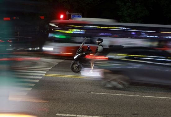야식 주문이 많아지는 시각, 한 배달 근로자가 질주하는 차들 사이에서 좌회전 신호를 기다리고 있다. 기다리기에는 지루한 시간이고, 휴식이라기에는 너무 짧은 시간이다. (경기도 성남시)