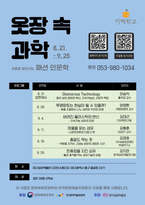 대구섬유박물관 패션인문학 강좌는 섬유·패션을 과학과 인문학의 관점에서 풀어내는 두 가지 주제로 구성된다.