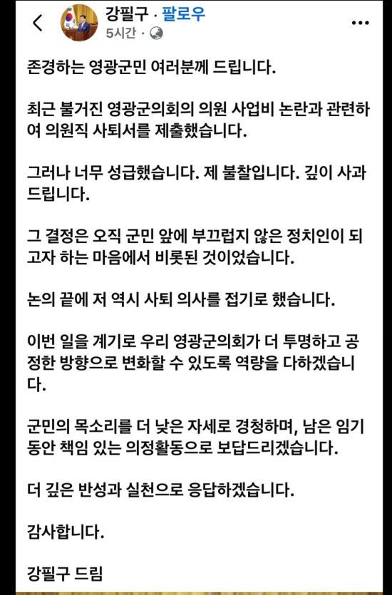 21일 영광군의회 및 지역 정계 관계자 등에 따르면 강필구 의원은 지난 17일 오후 자신의 페이스북을 통해 "너무 성급한 결정이었다. 깊이 사과드린다"며 "부끄럽지 않은 정치인이 되기 위해 내린 결정이었으나, 사퇴 의사를 접기로 했다"고 입장을 밝혔다.